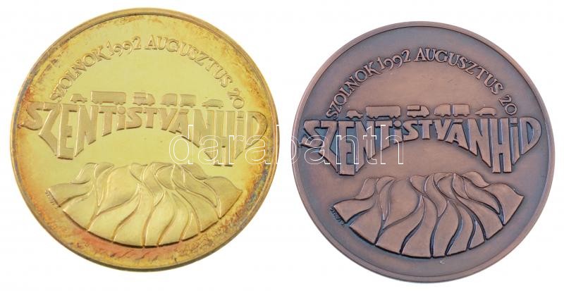 Győrfi Sándor (1951-) 1992. "Szent István híd - Szolnok 1992. augusztus 20 / Jász-Nagykun-Szolnok Megye" Br emlékérem (42,5mm) + "Szent István híd - Szolnok 1992. augusztus 20 / Jász-Nagykun-Szolnok Megye" aranyozott Ag emlékérem (36,59g/0.835/42,5mm) T:1,1 (eredetileg PP)