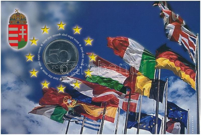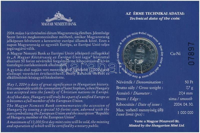 Leírás: 2004. 50Ft Cu-Ni "Magyar Köztársaság az Európai Unió tagja" első napi veret, sorszámozott "07897" emléklapon T:BU