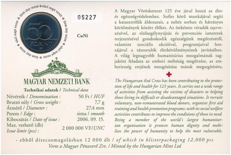 Leírás: 2006. 50Ft "125 éves a Magyar Vöröskereszt" első napi veret sorszámozott emléklapon "05227" T:1