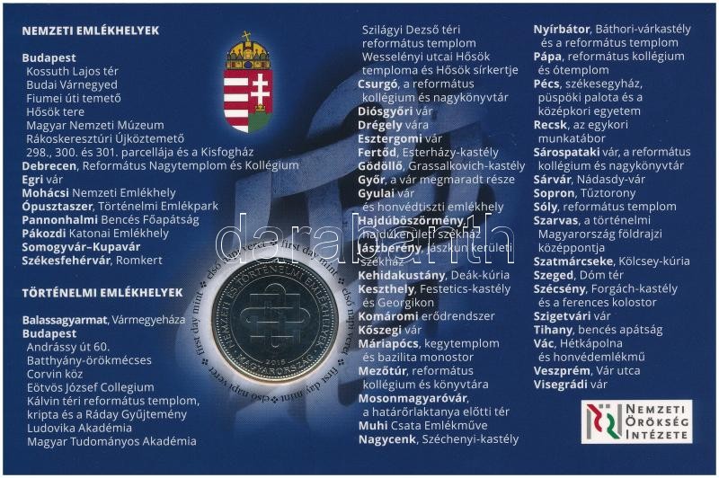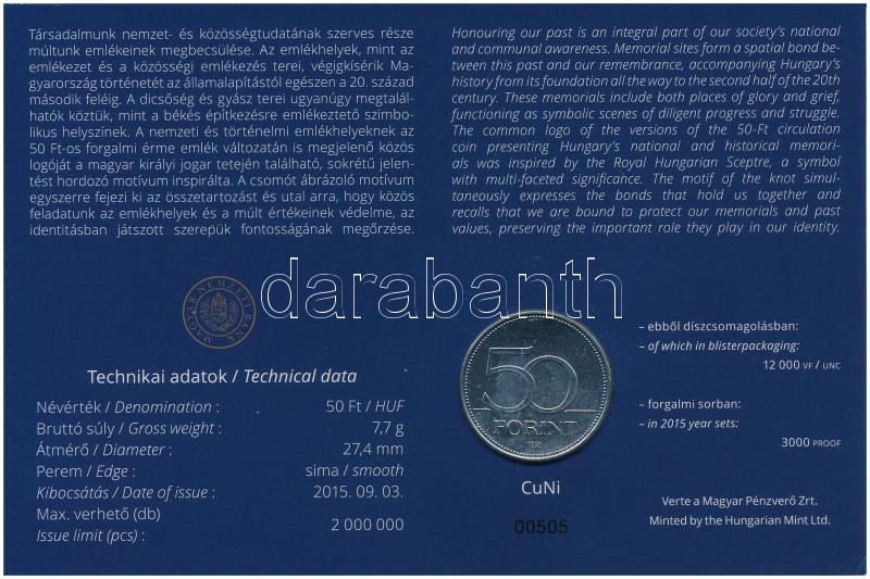 Leírás: 2015. 50Ft Cu-Ni "Nemzeti és Történelmi Emlékhelyek" első napi veret számozott emléklapon, "03149" sorszámmal T:1