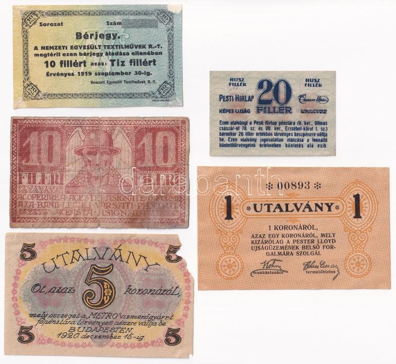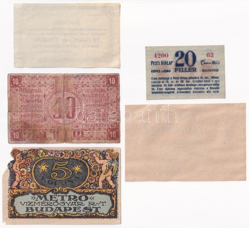 Leírás: ~1919-1920. 5db klf szükségpénz, közte Budapest / Metro Vízmérőgyár Rt. 1920. 5K utalványa, Románia / Temesvár 1919. 10f T:I-IV