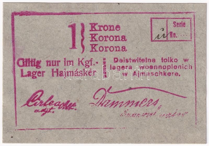 Leírás: Hajmáskér / Hadifogolytábor 1914. 1K I. kiadásT:I,I- sarkoknál ragasztónyom / Hungary / Hajmáskér / POW Camp 1914. 1 Korona 1st issue C:UNC,AU glue marks on the cornenrs Adamo HHH-1.1
