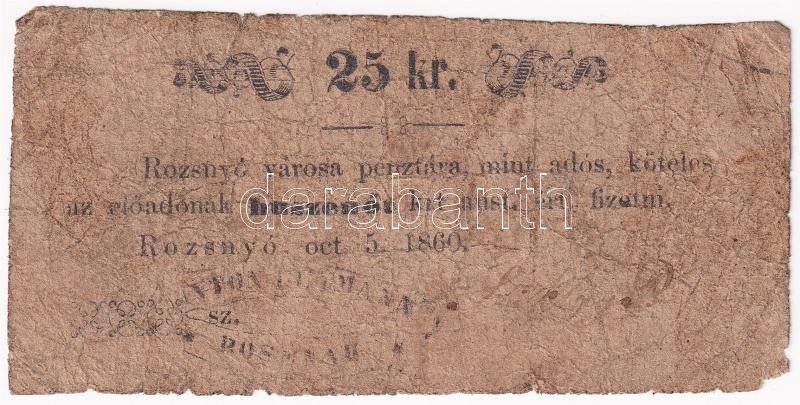 Leírás: Rozsnyó 1860. 25kr "Rozsnyó város pénztára", szövegben: "mint adós" T:IV Adamo ROZ-3.2.2
