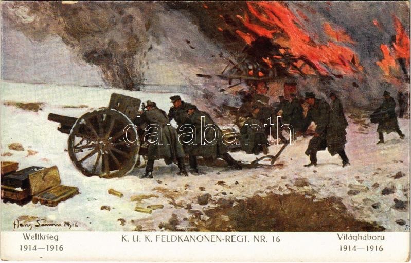 K.u.k. Feldkanonen-Rgt. Nr. 16. Weltkrieg 1914-1916. Farben-Klischee A. Krampolek. Verlag K.u.k. Kmdo. der 27. Inf. Trp. Dion. / A tiszta jövedelem a Kárpátokban elpusztított falvak újjáépítésére és a második hadsereg legénységi özvegyei és árvái alapítványra fordíttatik / WWI Austro-Hungarian military art s: Hans Larwin