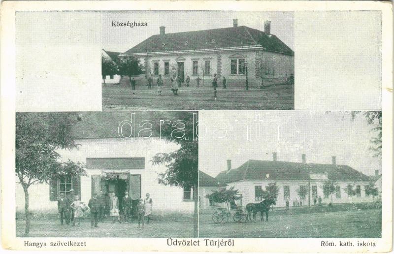 Leírás: Türje, Községháza, Római katolikus iskola, Hangya szövetkezet üzlete és saját kiadása (Rb)