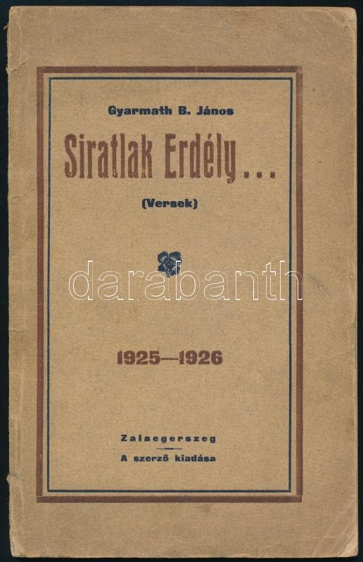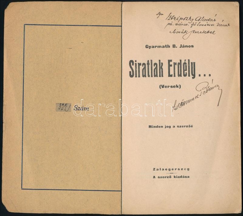 Leírás: Gyarmath B. János: Siratlak, Erdély... (Versek) 1925-1926. Dedikált, sorszámozott. Zalaegerszeg, Szerzői. Kiadói papírkötésben, sérült