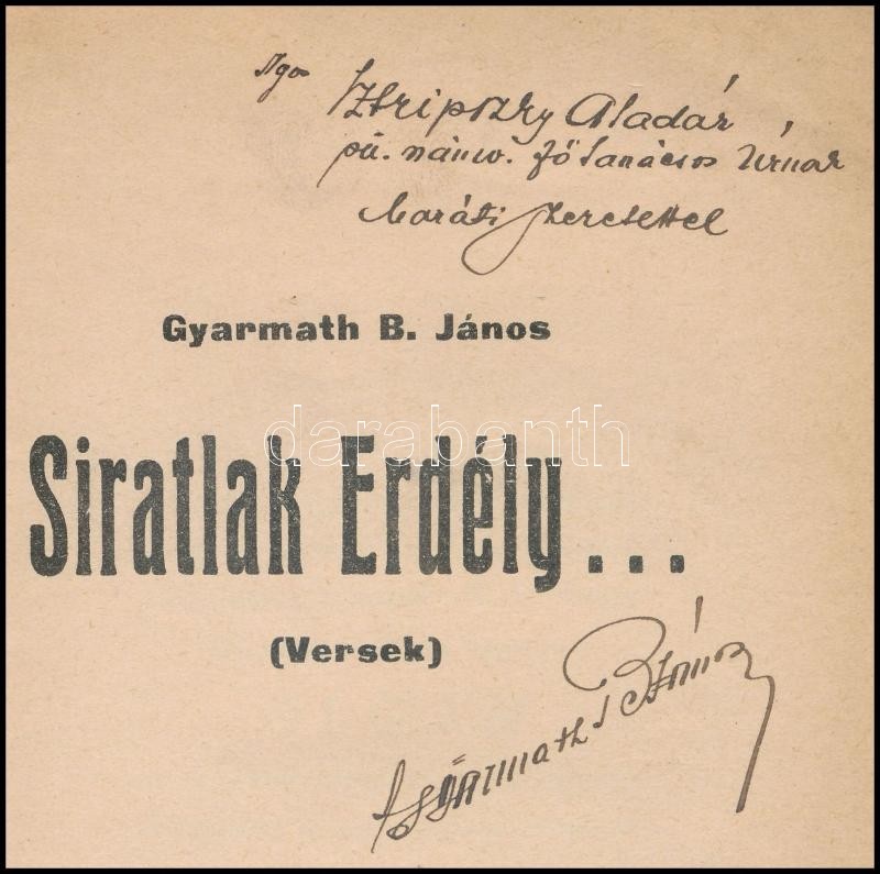 Gyarmath B. János: Siratlak, Erdély... (Versek) 1925-1926. Dedikált, s... https://www.darabanth.com/hu/406-Gyorsarveres/406.0/Konyvek/Konyvek-Egyeb-ritkasagok~1000023/Gyarmath-B-Janos-Siratlak-Erdely-Versek-1925-1926-Dedikalt-sorszamozott-Zalaegerszeg~II2511314