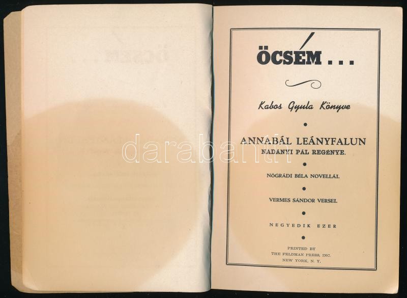 Kabos Gyula: Öcsém... - Kabos Gyula Könyve. - Nadányi Pál: Annabál Leányfalun. - Nógráfi Béla novellái. - Vermes Sándor versei. New York [é.n.] The Feldmann Press. 79 l. Kiadói, színes, illusztrált papírborítóban. Foltos lapokkal