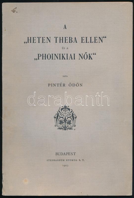Pintér Ödön: A " Heten Theba ellen " és a " Phoinikai nők ". A szerző által dedikált! Bp., 1907, Stephaneum Nyomda. Kiadói papírkötés, kissé foltos borítóval.