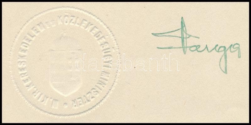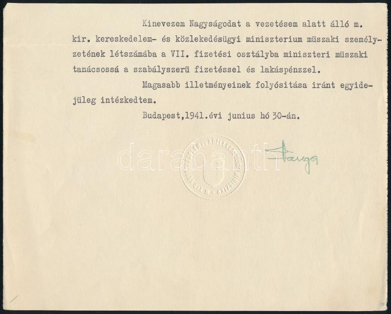 Leírás: 1941 Varga József (1891-1956) kereskedelem és közlekedésügyi miniszter aláírása kinevezési okmányon, vágott