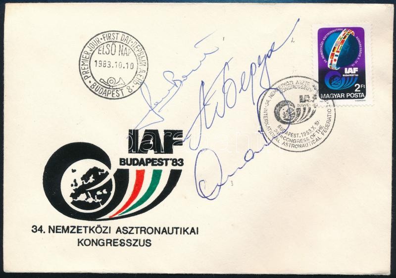 Leírás: 1983 Farkas Bertalan, Dumitru Prunariu Valerij Kubaszov űrhajósok autográf aláírása IAF borítékon / Autograph signatures of Romanian, Russian and Hungarian Astronauts
