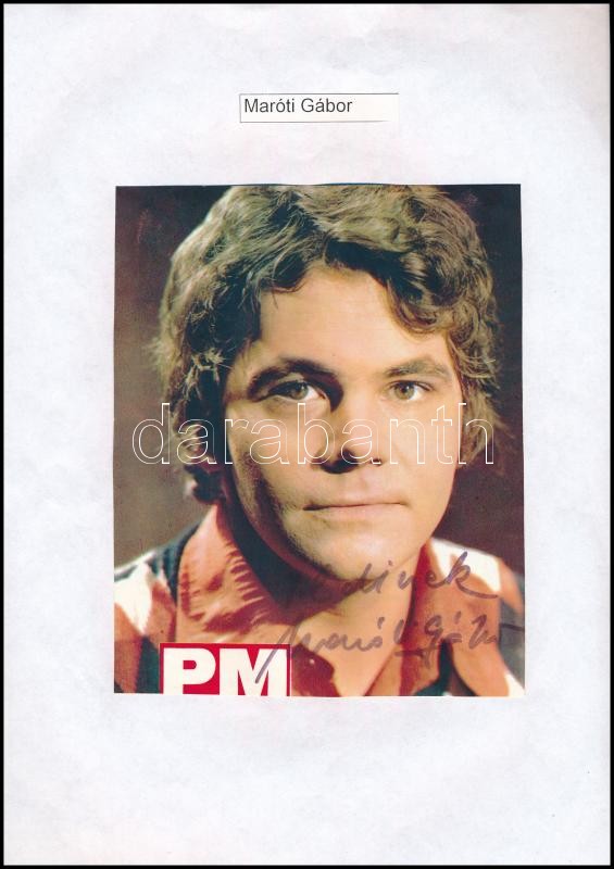 Leírás: Maróti Gábor (1947-2010) színművész aláírása az őt ábrázoló újságkivágáson