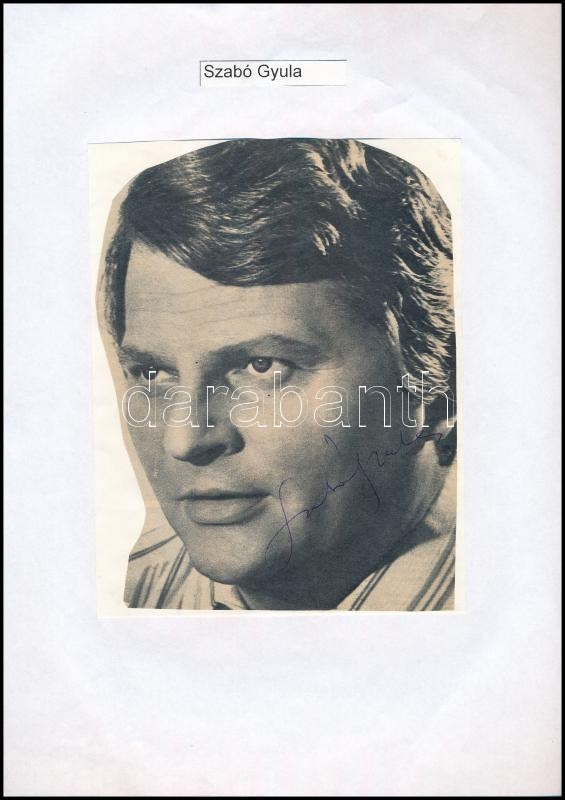 Leírás: Szabó Gyula (1930-2014) színész aláírása az őt ábrázoló újságkivágáson