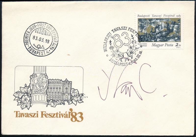 Leírás: Szász Endre (1927-2003) saját kezű aláírása a Budapesti Tavaszi Fesztivál borítékján az általa tervezett bélyeggel, alkalmi bélyegzéssel