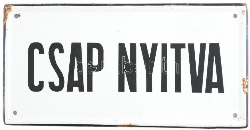 Leírás: "Csap nyitva" feliratos zománcozott fém tábla, szélein kisebb sérülésekkel, 15x30 cm