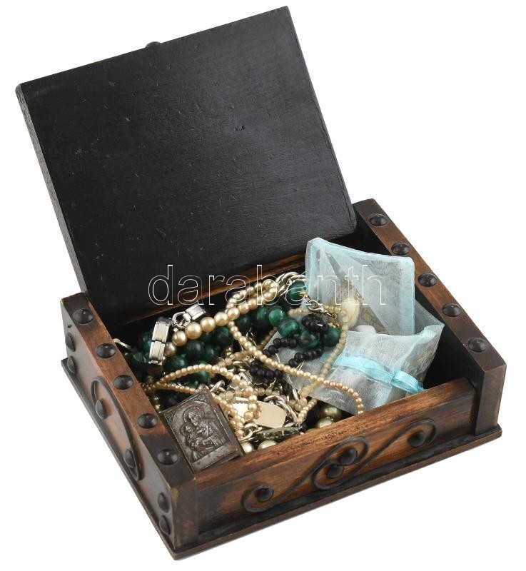 Leírás: Fa doboz, vegyes bizsukkal. 16,5x13x 5 cm