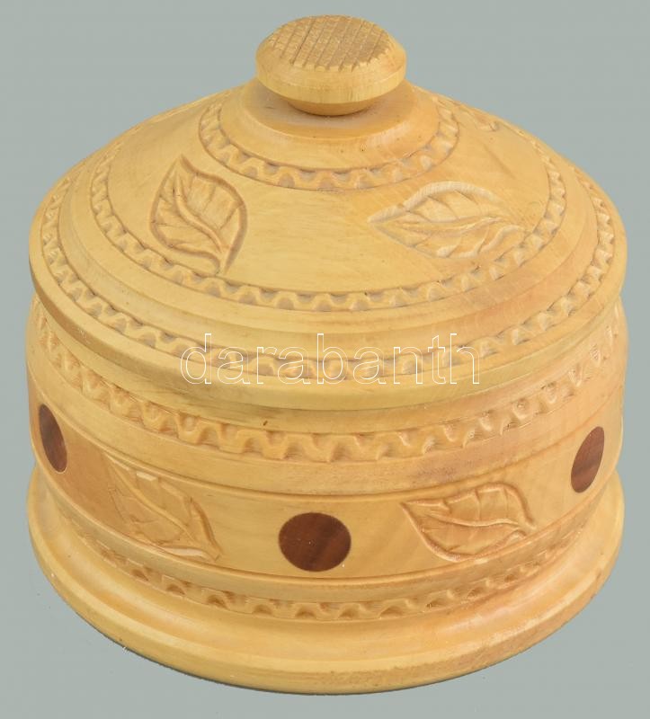 Leírás: Faragott, lakkozott fa doboz. d:12 cm