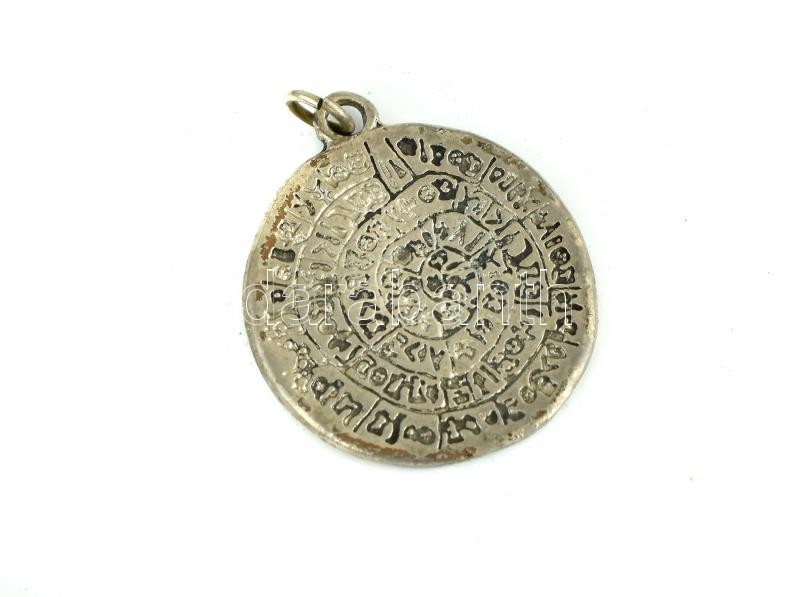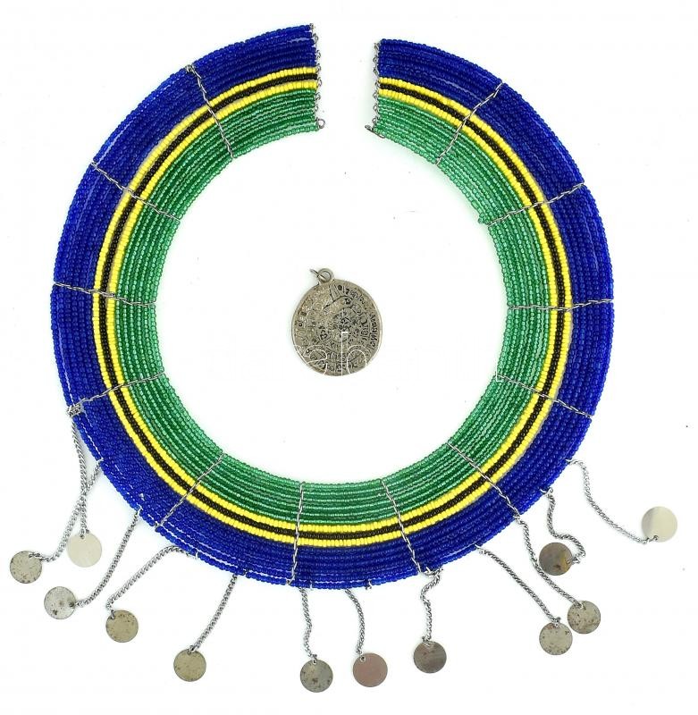 Leírás: Gyöngy nyakék fém függőkkel, d: 20 cm, belső átmérő: 12,5 cm + fém medál, d: 3,5 cm