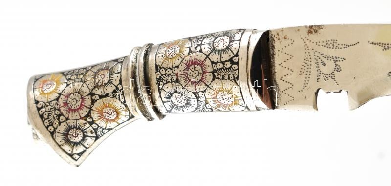 Leírás: Indiai kukri tőr, díszes markolattal és pengével, tokkal, kisebb kopásnyomokkal, h: 32 cm