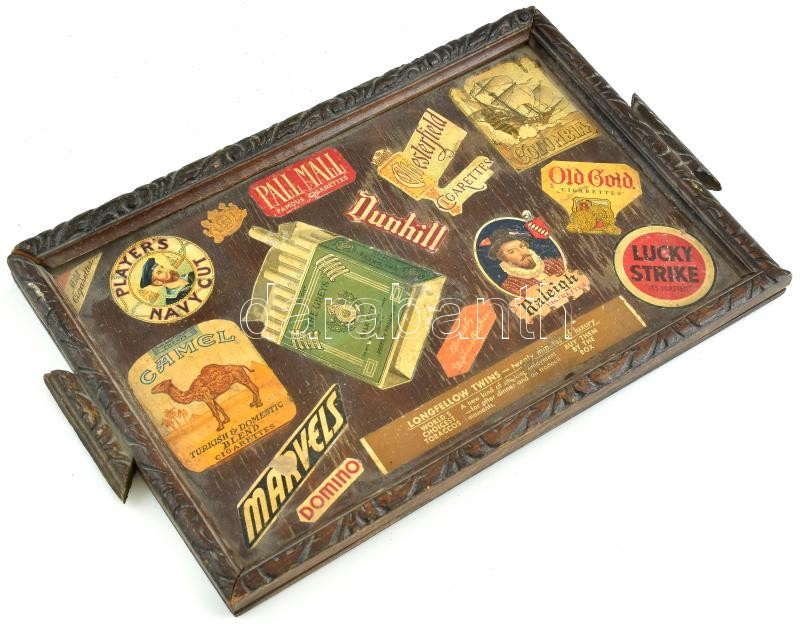 Leírás: Tálca, cigaretta papírokkal díszítve, fa, kopott, 20x32cm