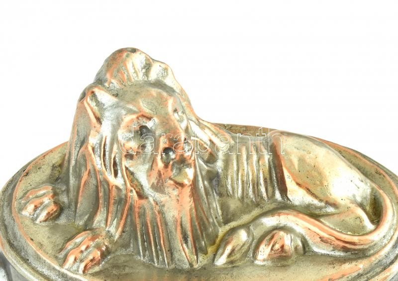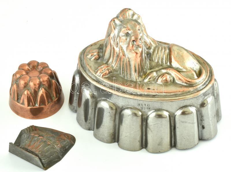 össz. 3 db régebbi dekoratív könnyűfém sütőforma, egyik közepes méretű, tetején oroszlánt ábrázoló plasztikus díszítéssel, 14x18,5x13,5 cm; egyik kis méretű plasztikus szárnyas díszítéssel, m: 6 cm és h. 6,5 cm; másik kis méretű m: 5 cm és d: 7 cm. Mindegyik kopásnyomokkal