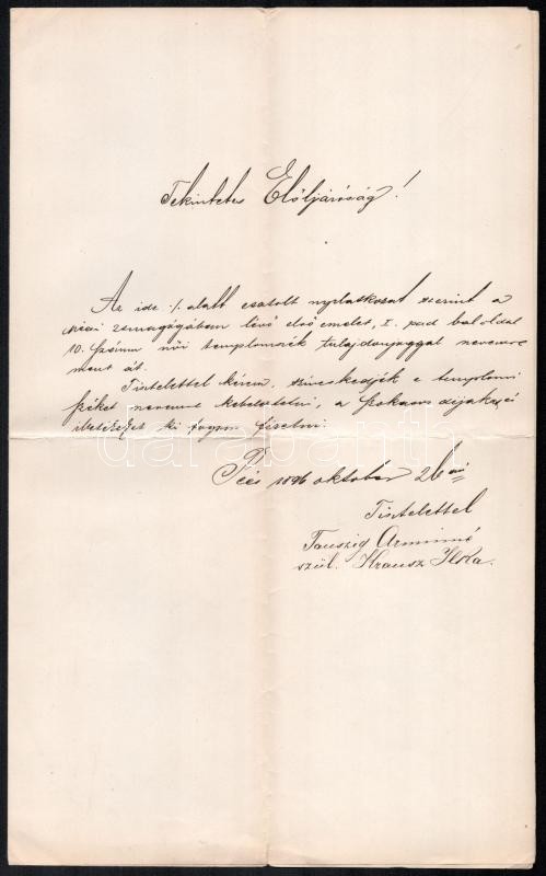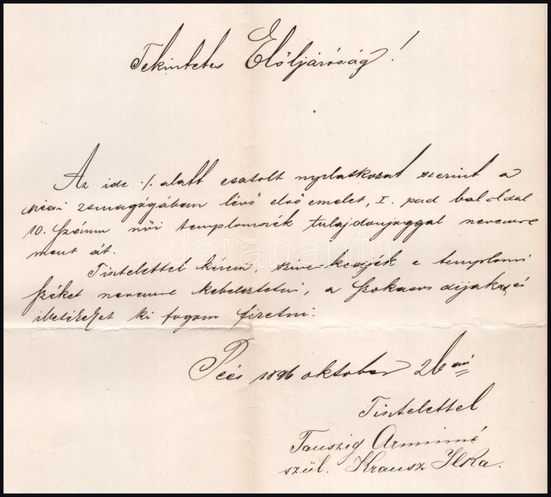 Leírás: 1896 A pécsi zsinagógába vásárolt templomszék Tauszig Árminné új tulajdonos nevére való kebeleztetési igénye a Pécsi Izr. Hitközség elöljáróságának.