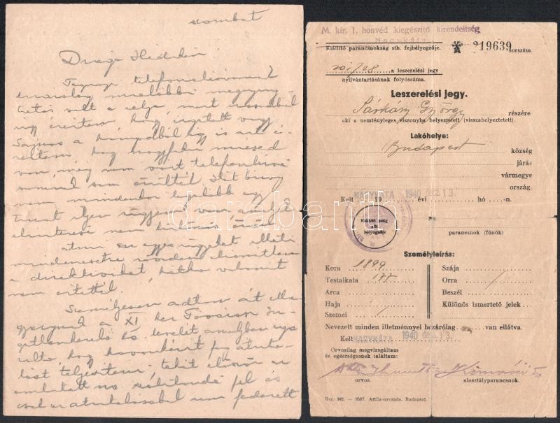 Leírás: 1938-42 Munkaszolgálatos 8 db levelezőlapja, 1 db levele, leszerelési jegye és egy illetőségi bizonyítványa, leszerelési jegy szakadásokkal