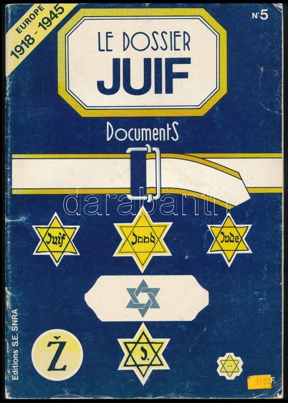Leírás: 1979 Le Dossier Juif. Documents. Europe 1918-1945. Paris, Editions S.E. SNRA, 76 p. Fekete-fehér fotókkal illusztrálva, francia nyelven. Tűzött papírkötés, kopott borítóval, helyenként kissé sérült lapokkal.
