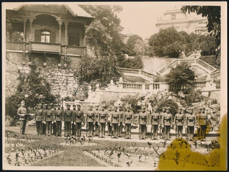 Leírás: 1930 A Darabont testőrség parancskihirdetése a Királyi kertben, háttérben a "Paraszt ház" 24x18 cm Foltos