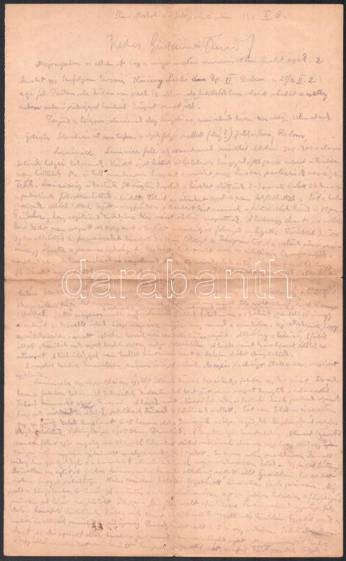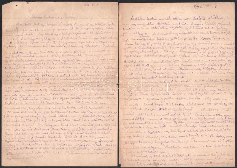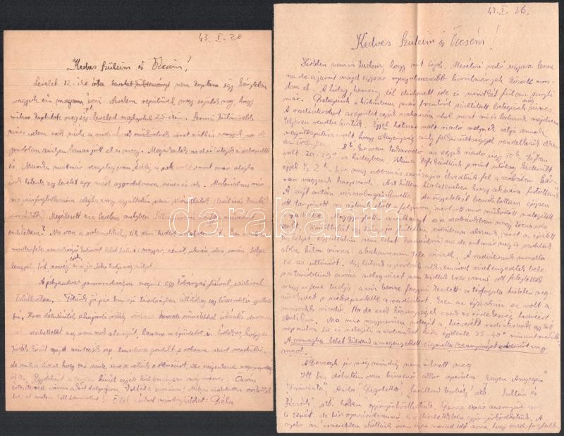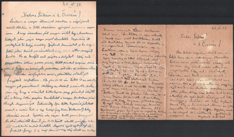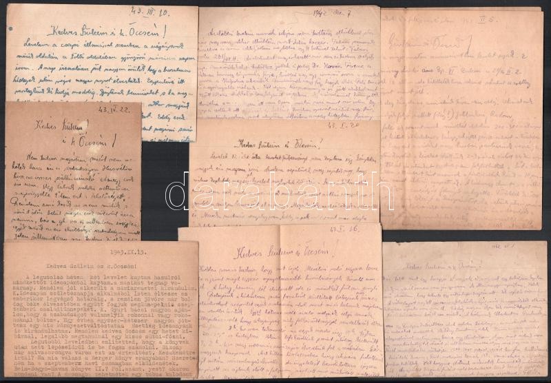 1942-1943 Bakay Béla sebesültszállító karpaszományos őrmester 8 db sűrűn teleírt kortörténeti levele családjához az orosz frontról, a néhol magyar katonai ruhába öltözött partizánok által támadott vonatkiutazásról, a harkovi, viszonylag békés néhány hetének mindennapjairól, neves magyar színészek ottani fellépéséről, stb.