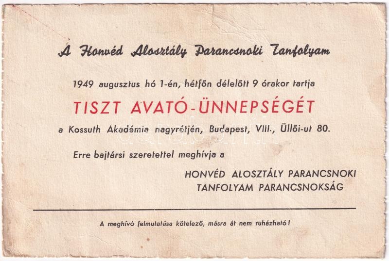1949 A Honvéd Alosztály Parancsnoki Tanfolyamának tiszti avatóünnepség... https://www.darabanth.com/hu/406-Gyorsarveres/406.0/Mutargy-papirregiseg-egyeb/Militaria~500028/1949-A-Honved-Alosztaly-Parancsnoki-Tanfolyamanak-tiszti-avatounnepsegenek-meghivoja-a-Koss~II2509757