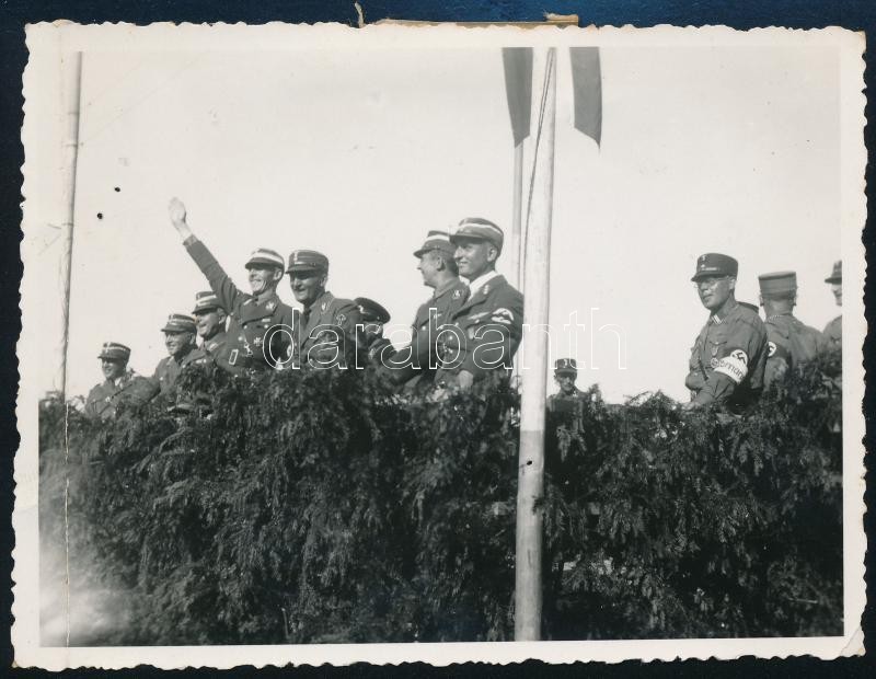cca 1933-1934 SA (Sturmabteilung) dísztribün magas rangú katonákkal, középen a karját lendítő Friedrich-Wilhelm Krüger (1894-1945) SA-, később SS-Obergruppenführer, a Lovagkereszt birtokosa, a háború végén öngyilkos lett, fotó, szélén törésnyom, 8,5×11 cm