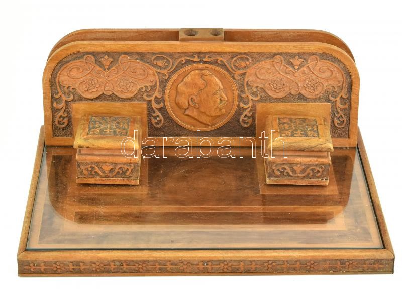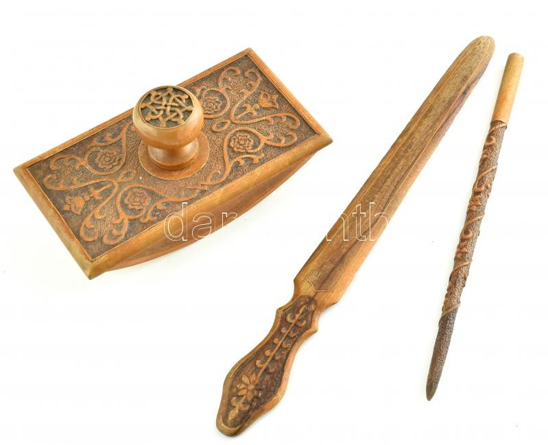 Íróasztal garnitúra, díszesen faragott fa, 1900 körül, kopott, apró sé... https://www.darabanth.com/hu/406-Gyorsarveres/406.0/Mutargy-papirregiseg-egyeb/Mutargyak-antikvitas~500008/Iroasztal-garnitura-diszesen-faragott-fa-1900-korul-kopott-apro-serulesekkel-egy-db-h~II2505598