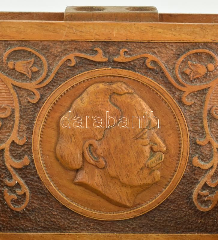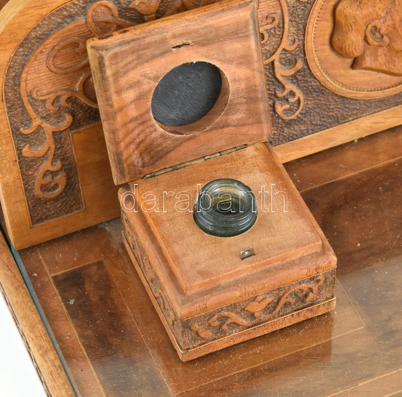 Leírás: Íróasztal garnitúra, díszesen faragott fa, 1900 körül, kopott, apró sérülésekkel, egy db hiányzó toll. 35x23x14 cm