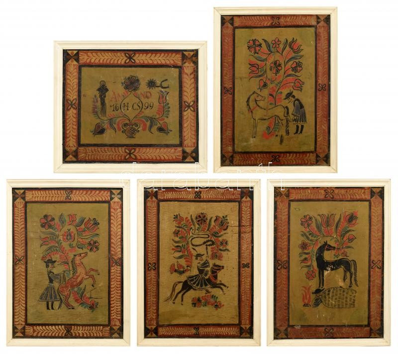 Jelzés nélkül: 5 db Népi ornamentika. Olaj, falemez. Egyik HCs monogrammal és 1699es jelzéssel. XX. sz. közepe. Sérült. Fa keretben. Kopott, apró sérülésekkel. cca. 32,5x39,5 cm