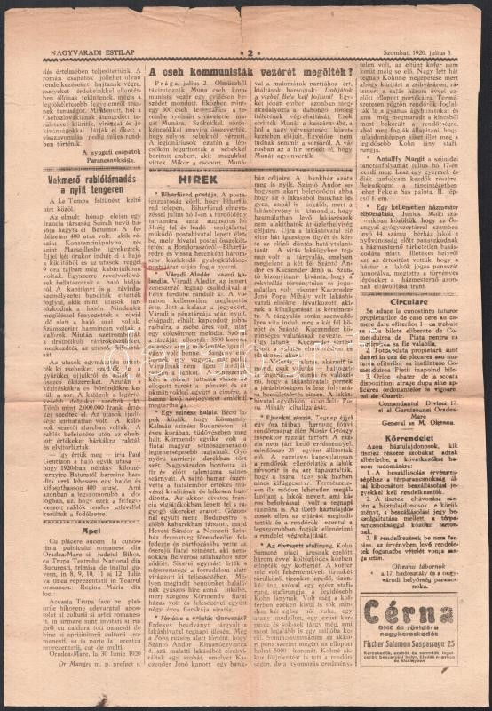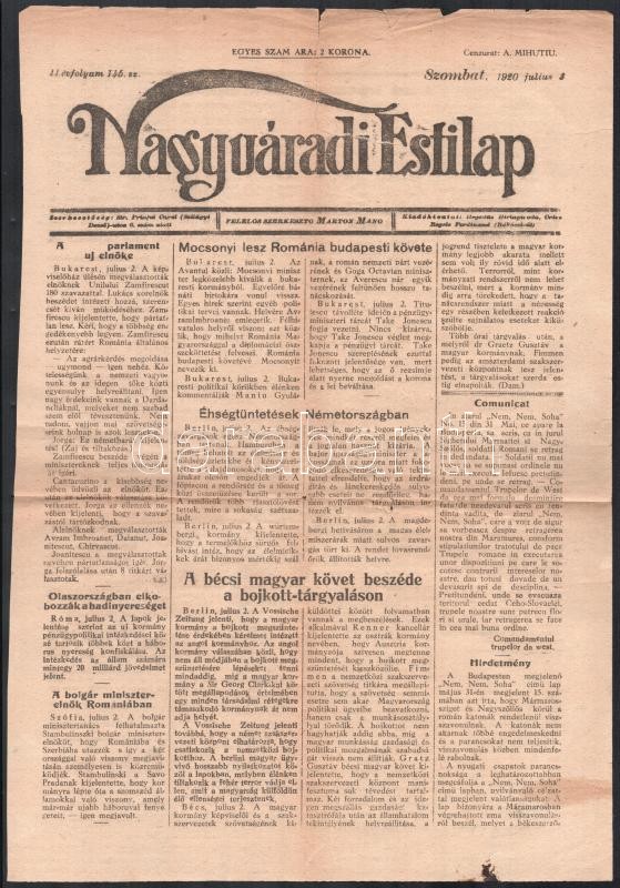 1920 Nagyváradi Esti Lap román cenzúrával https://www.darabanth.com/hu/406-Gyorsarveres/406.0/Mutargy-papirregiseg-egyeb/Nyomtatvanyok~2500002/1920-Nagyvaradi-Esti-Lap-roman-cenzuraval~II2511513