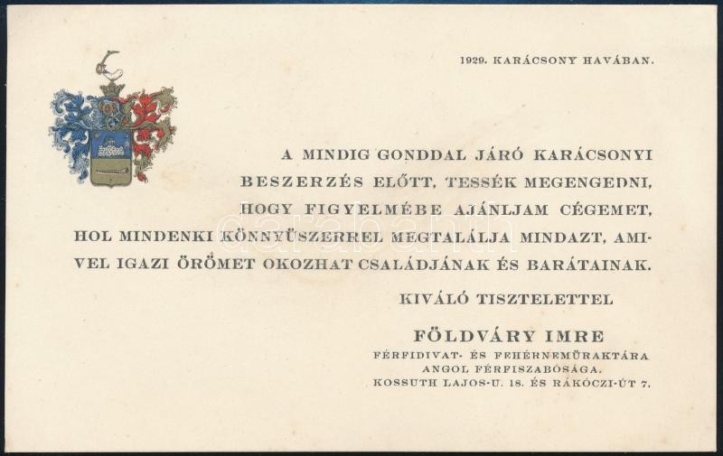 Leírás: 1929 Földváry Imre férfidivat és fehérneműraktárának levelezőlapja