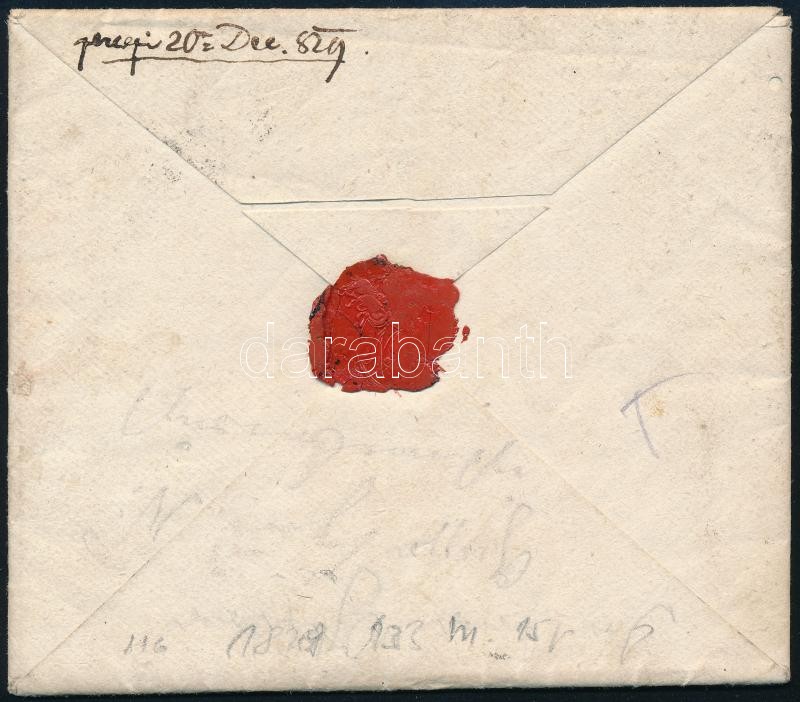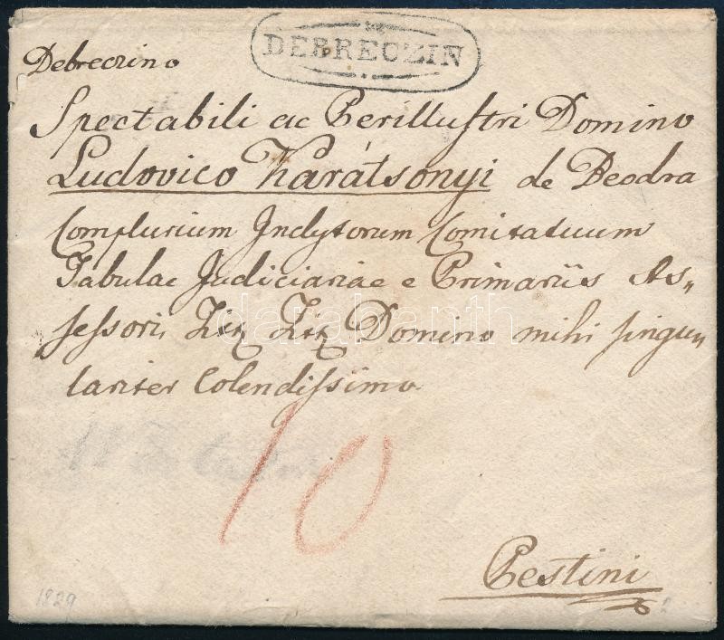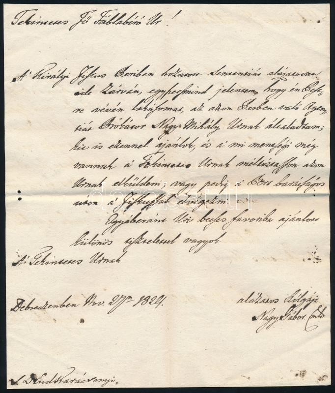 1829 Debrecen, Nagy Gábor (1770-1861) ügyvéd, táblabíró, kéziratgyűjtő saját kezűleg írt levele és borítékja, a beodrai Karátsonyi család tagjának címezve