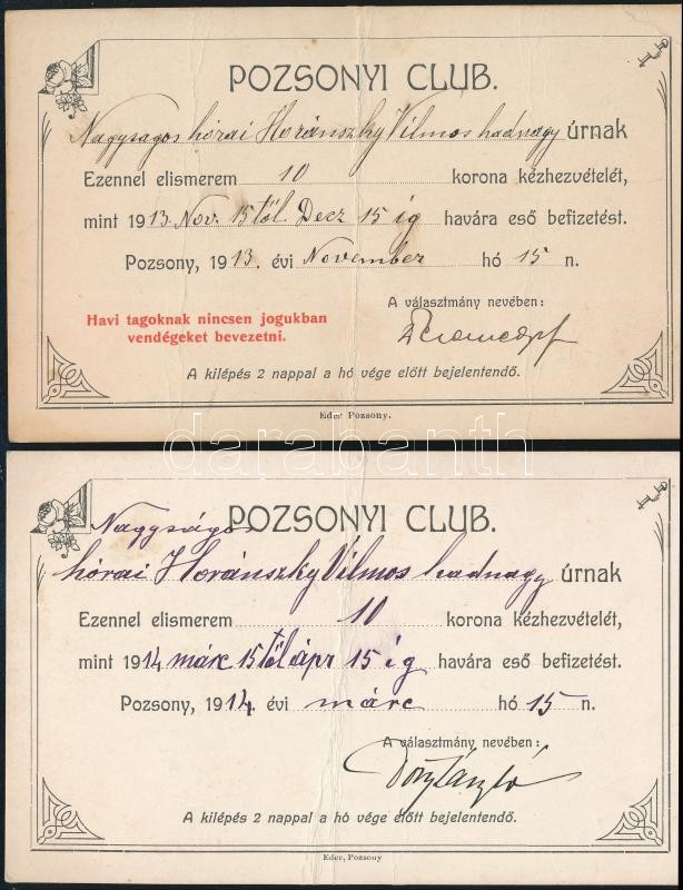 Leírás: 1913, 1914 Pozsonyi Club 2 db havi befizetés igazolványai Hajtva