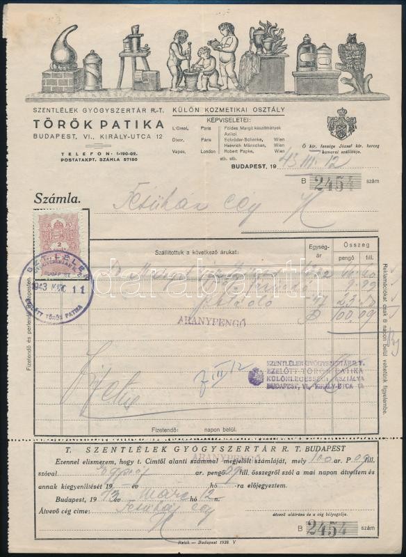 Leírás: 1943 Bp., Szentlélek Gyógyszertár Rt. Török Patika fejléces számlája, okmánybélyeggel, hátoldalán kézzel írt levél