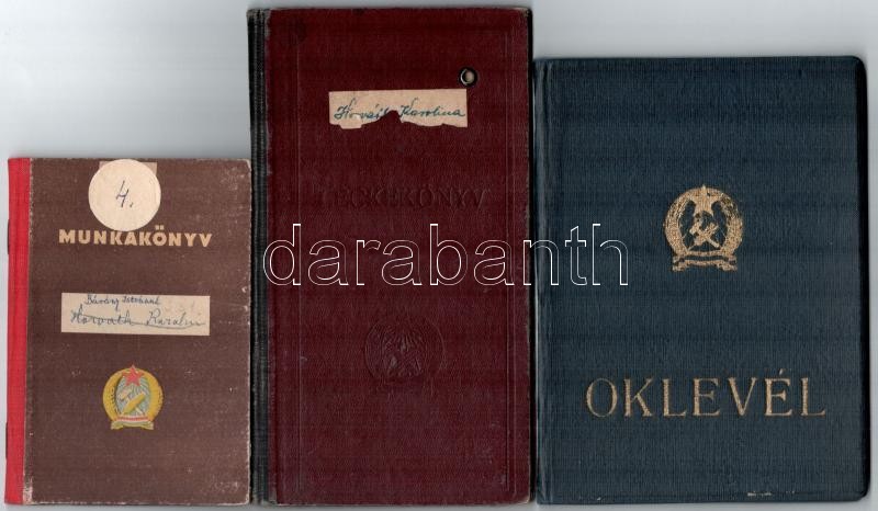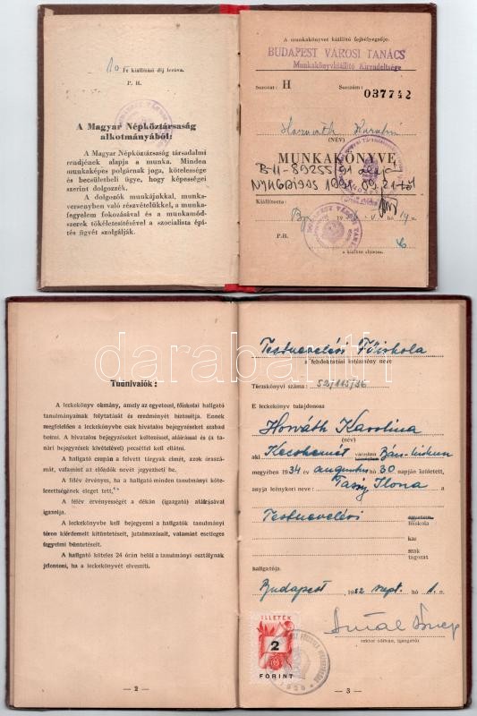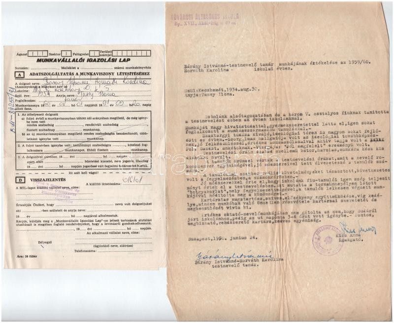 1952-1960 Testnevelő tanár iratai, 5 db: Testnevelési Főiskola leckekönyv és testnevelő tanári oklevél + munkakönyv, munkavállalói igazolás és értékelés