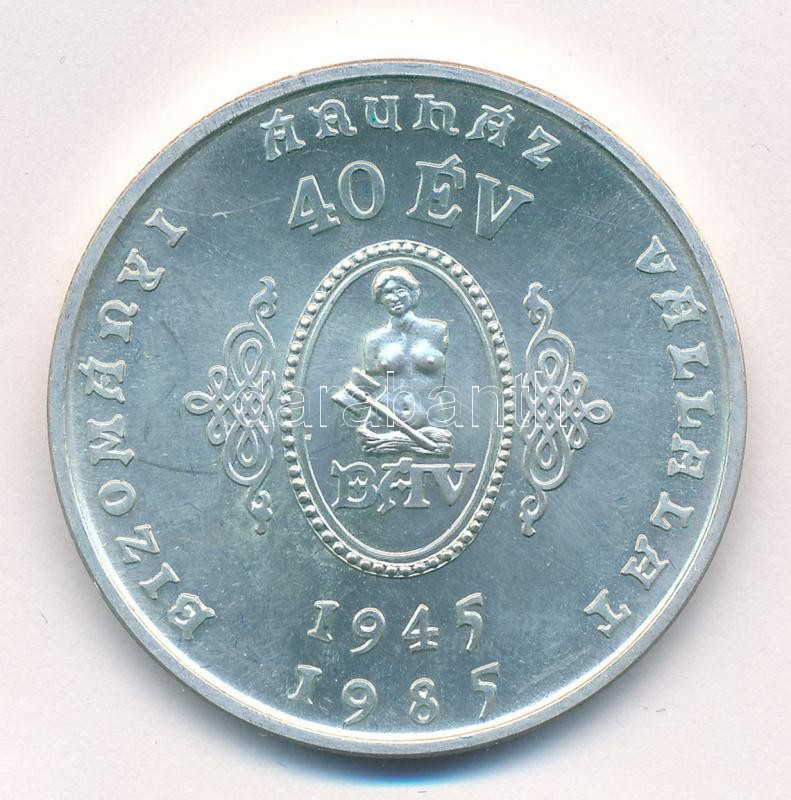 Leírás: 1985. "Bizományi Áruház Vállalat - Hazánk felszabadulásának 40. évfordulója alkalmából" jelzett Ag emlékérem (36,51g/0.925/42,5mm) T:1