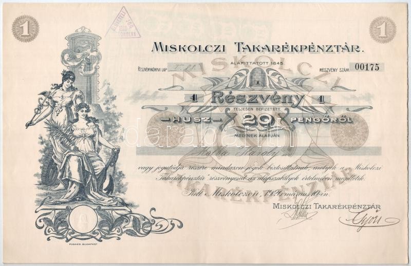Miskolc 1926. "Miskolci Takarékpénztár" névre szóló részvénye 20P-ről,... https://www.darabanth.com/hu/406-Gyorsarveres/406.0/Numizmatika/Reszvenyek-es-sorsjegyek~2000005/Miskolc-1926-Miskolci-Takarekpenztar-nevre-szolo-reszvenye-20P-rol-szelvenyekkel-sza~II2511536