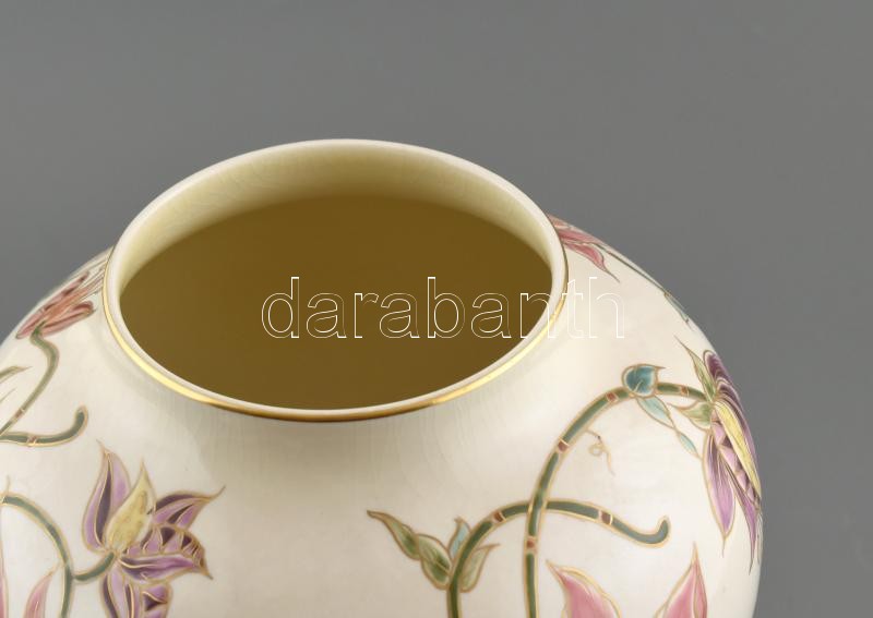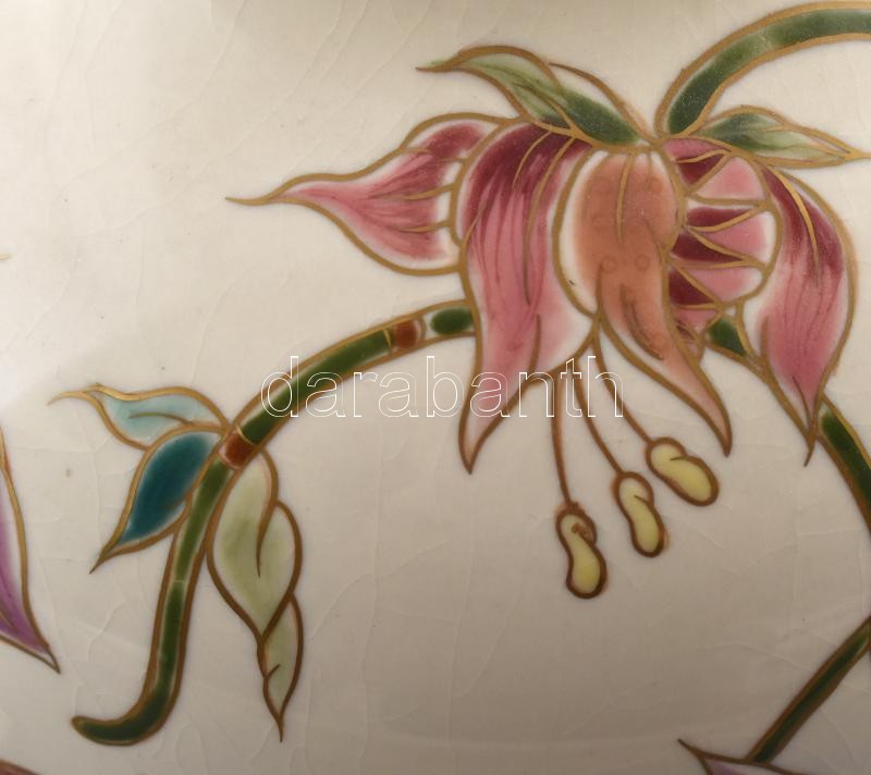 Leírás: Zsolnay virág mintás fedeles váza. Kézzel festett, jelzett, gyártáskori mázrepedéssel 36 cm
