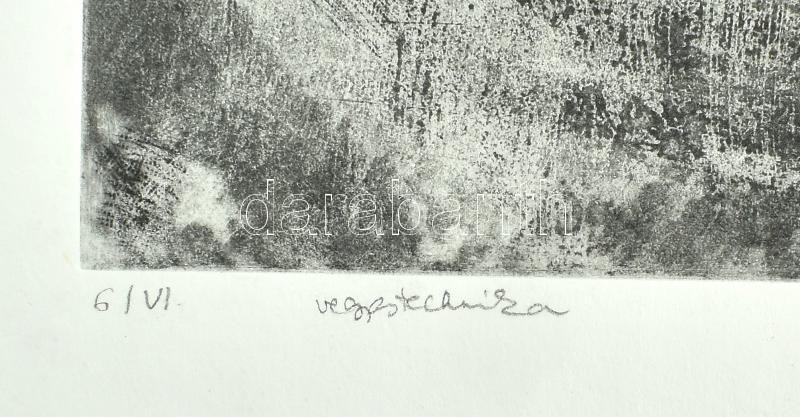 Leírás: B. Zs. jelzéssel: Absztrakt kompozíció. Vegyes technika, papír, számozott (6/VI), lap tetején és alján paszpartuzás nyomaival, 36,5x24 cm