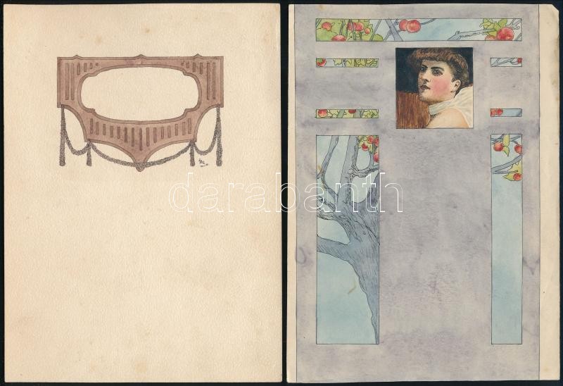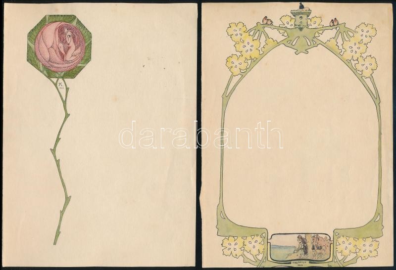 Leírás: KAE jelzéssel 4 db szecessziós levélpapír terv Akvarell, papír. cca 1900 Nagybánya. 19x15 cm