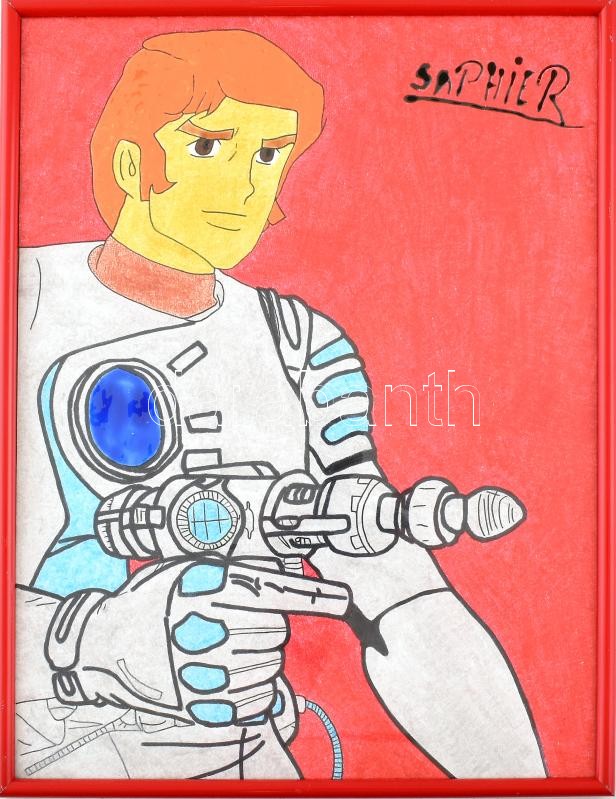 Leírás: Saphier jelzéssel: Captain Flam. Vegyes technika, papír. Üvegezett keretben. 40x30 cm