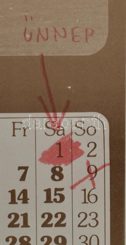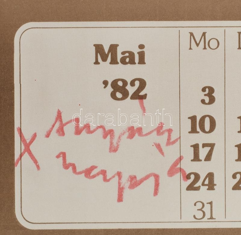 Lux Antal (1935-): Terminus V. (május), 1982. Ofszet, papír. Jelzett és datált (A. Lux '82). Művészpéldány e. a. jelzéssel. 37,5x26,5 cm. A Makói Grafikai Művésztelepen készült alkotás, gyűjtői darab!/ Antal Lux (1935-): Terminus V. Offset on paper. Signed and dated (A. Lux '82), e.a. artist's proof. 37,5x26,5 cm.