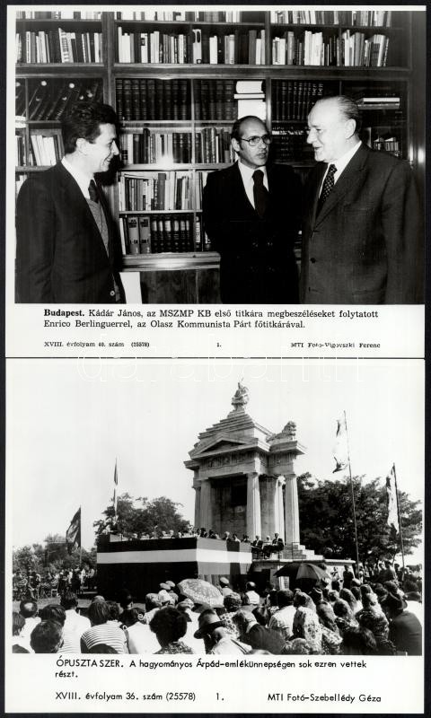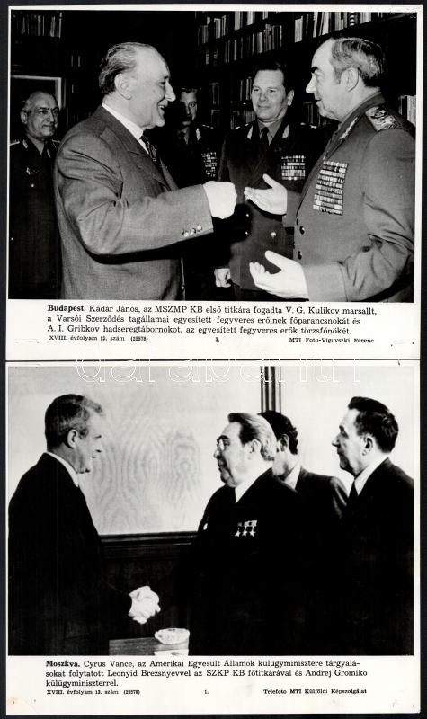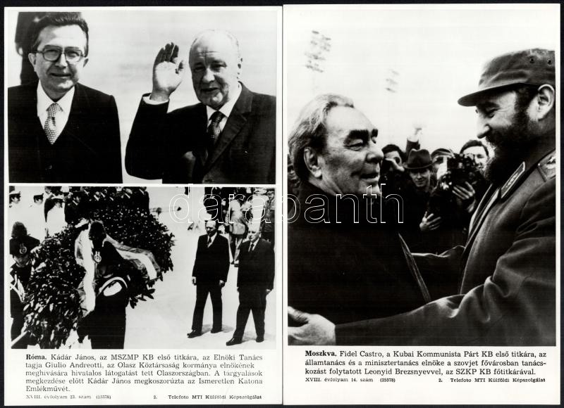 1977 MTI fotók, 7 db, 3 fotón Kádár Jánossal, 1 fotón Leonyid Brezsnyevvel, 1 fotón Brezsnyevvel és Fidel Castroval, és más ismert emberekkel, két fotó sarkain kis lyukakkal, eredeti MTI-s borítékban, 26x18 cm és 21x14 cm közötti méretben