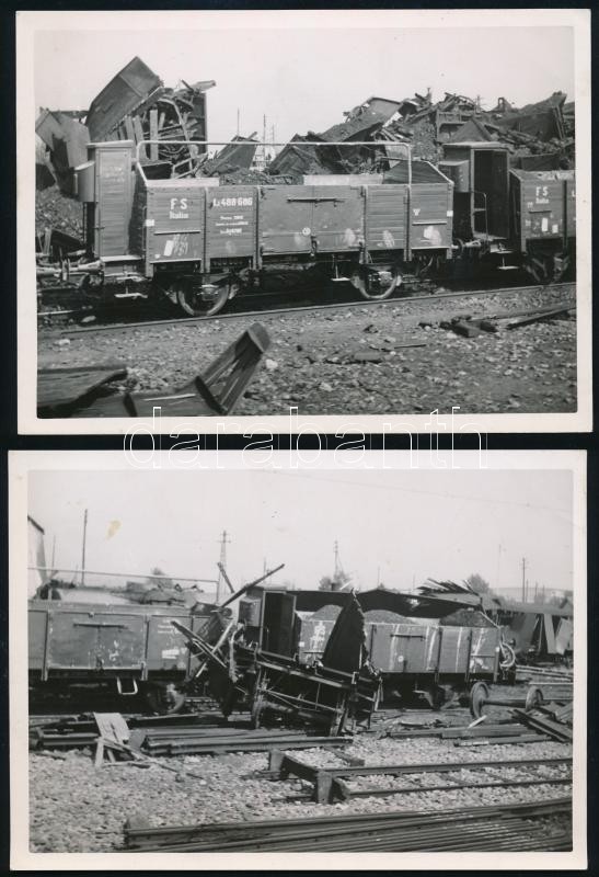 Leírás: cca 1940 Szétroncsolt vasúti szerelvényekről készült felvételek, 2 db pecséttel jelzett fotó, 18x13 cm